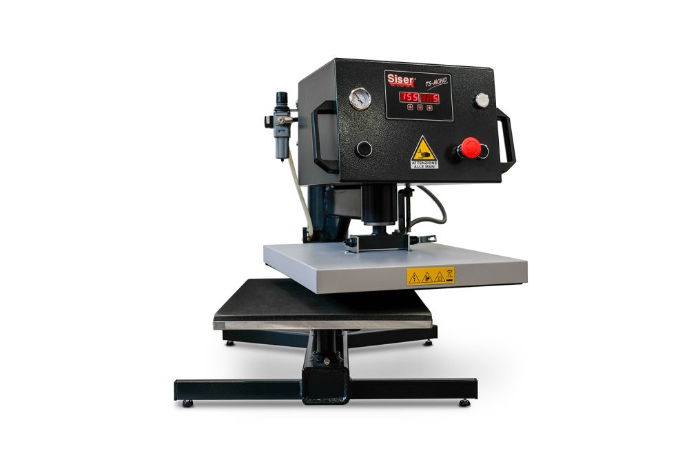 TS MONO היא מכונת העברת חום אוטומטית המספקת פונקציה פניאומטית ולוח תמיכה אחד, המתאימה לכל סוגי היישומים על טקסטיל (חומרי העברת חום, פלאסטיסול, סובלימציה). המשטח העליון נפתח אוטומטית ומסתובב הצידה, מה שמבטיח בטיחות במהלך ההפעלה. הרב-תכליתיות שלה מאפשרת למפעיל להדפיס על אובייקטים בעובי מקסימלי של 50 מ"מ (אלומיניום, קרמיקה וכו'). מכונות הדפסה (15 x 15 ס"מ או 15 x 38 ס"מ) וסטים לכובעים הם אופציונליים וזמינים בתוספת תשלום.